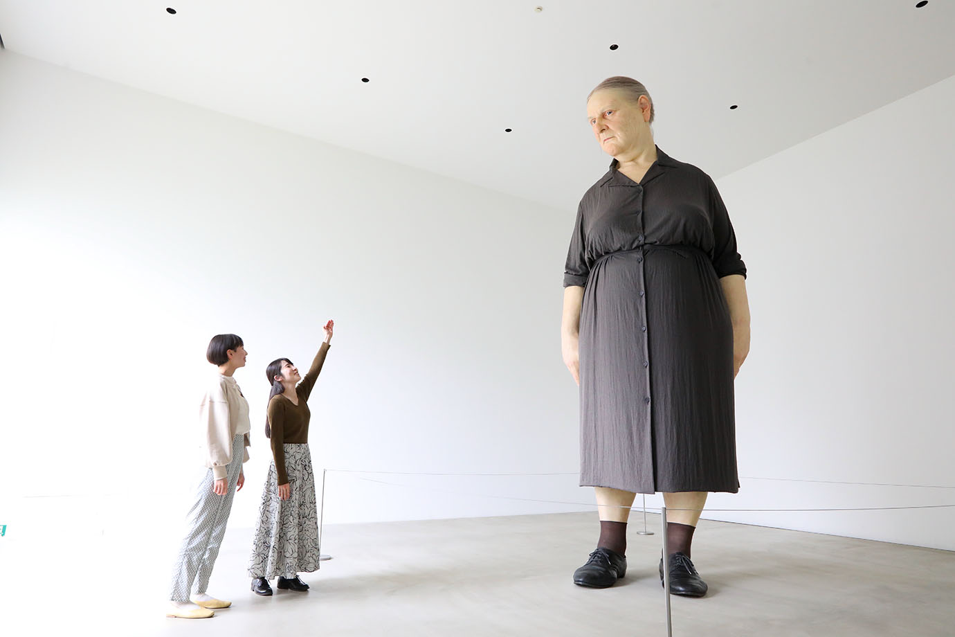 広い空間の中に一人たたずむ高さ4mもの女性像。洋服のひだや髪の毛の質感までとてもリアルに再現され、物憂げな表情で何かを見つめています。どこから見ても目が合わないから不思議。
