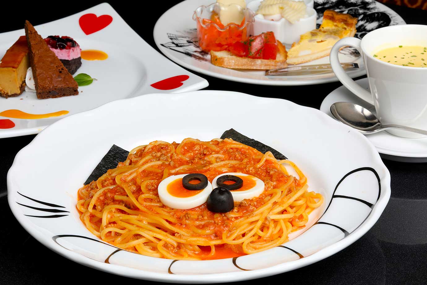 「チシャ猫仕立てのラグーソースパスタ」を含むランチコースは2500円、ディナーコースは3000円。料理やデザートをのせたプレートにもマッドハッターのお茶会やトランプ柄が描かれ、アリスの世界観を楽しめます。