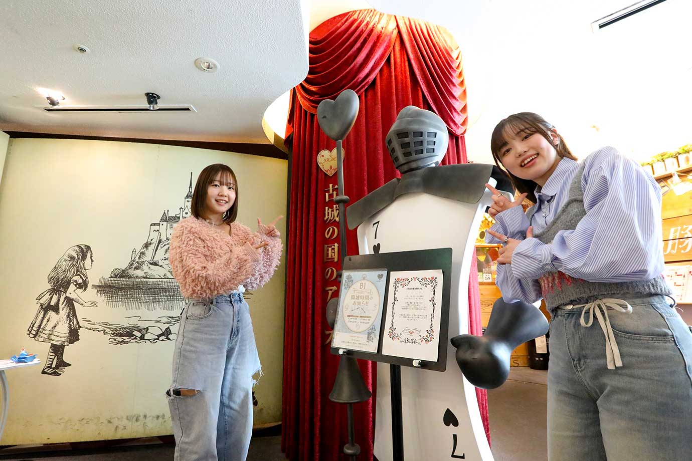 池袋の街中にあるビルの螺旋階段を下りた先に現れるのは大きな絵本の扉。槍を構えたトランプ兵が待ち構え、扉の向こうにはハートの女王の古城へと続いています。