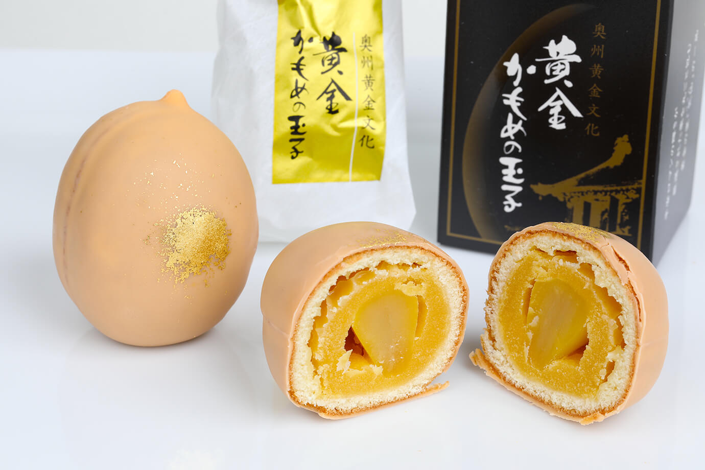 岩手みやげの王道といえば「かもめの玉子」ですが、なんと平泉にはゴージャスな黄金バージョンもあるんです!「黄金かもめの玉子」1個486円はチョコレートの表面に金箔が輝き、玉子の中には栗の甘露煮が入った豪華版。人気商品につき売切れごめん。