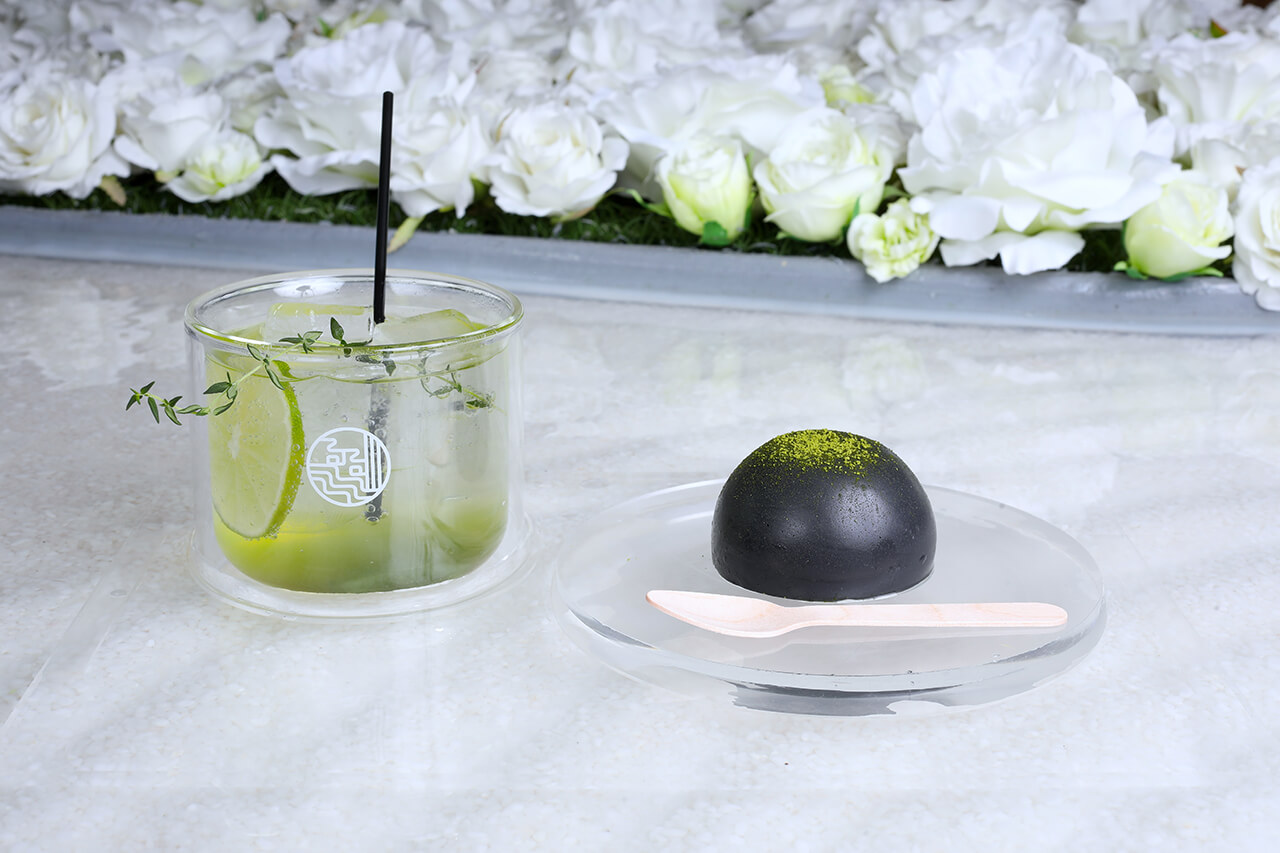 枯山水のような水のテーブルと和スイーツでほっとひと息