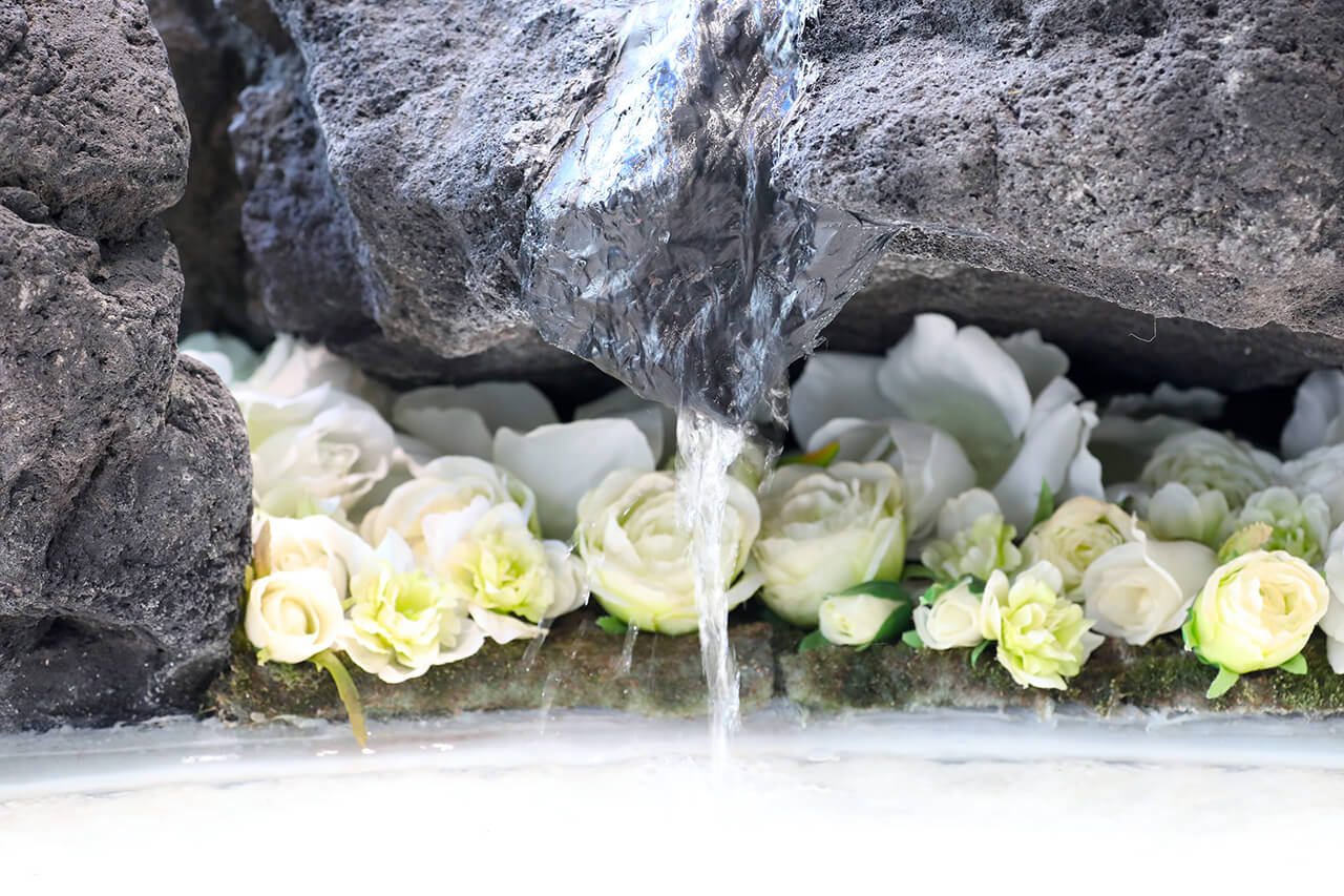 大きな溶岩石のオブジェからテーブルへと水が滴り、日本庭園のような趣に。