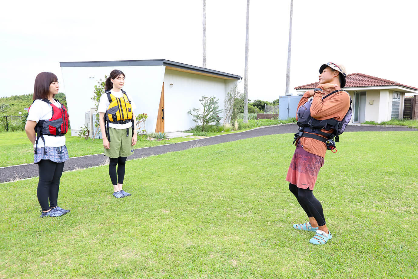 ライフジャケットを身につけたら、インストラクターの髙橋さんのレクチャーのもと、まずは陸上で乗り方、漕ぎ方のレクチャーを受けます。