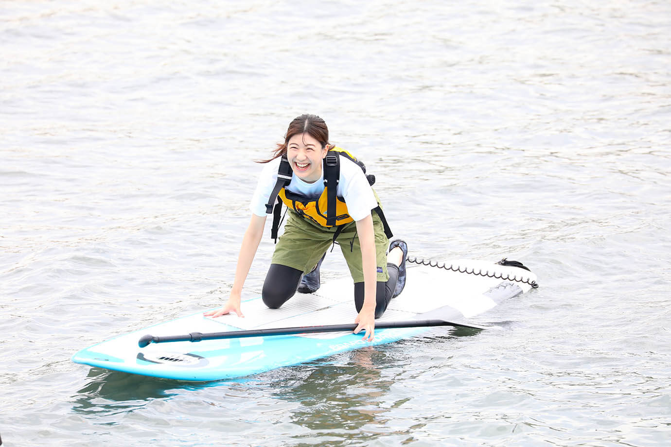 座り漕ぎに慣れてきたら、髙橋さんにボードを支えてもらってゆっくり立ち上がります。肘を曲げずにパドルを持ち、海面に垂直になるように漕いでいきます。