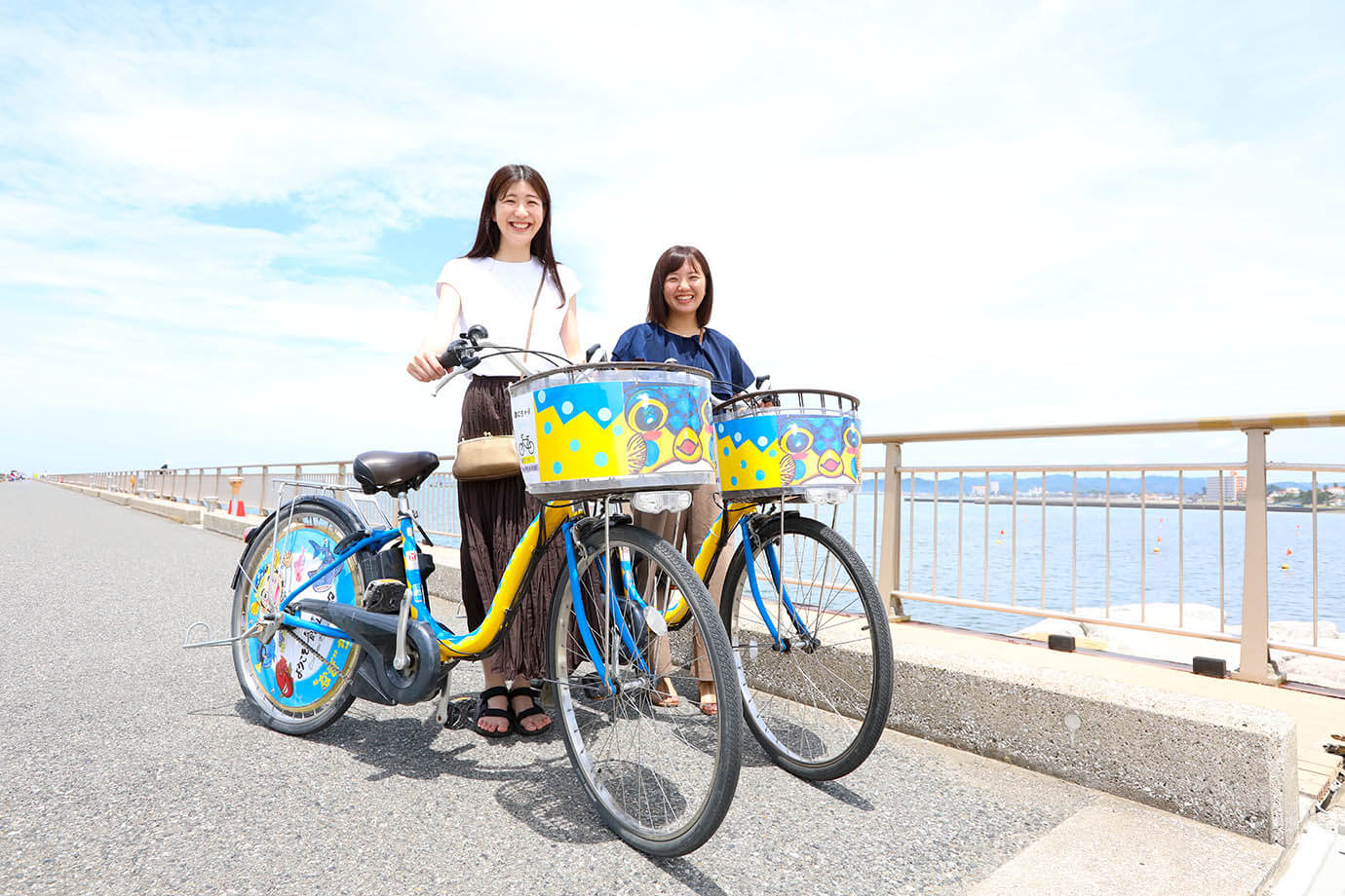 “渚の駅”たてやま名誉駅長さかなクンのイラストを施したカラフルな「なぎちゃり」。電動アシスト付きなので移動もラクラク♪近くの沖ノ島にも15分ほどで行けちゃうんです。