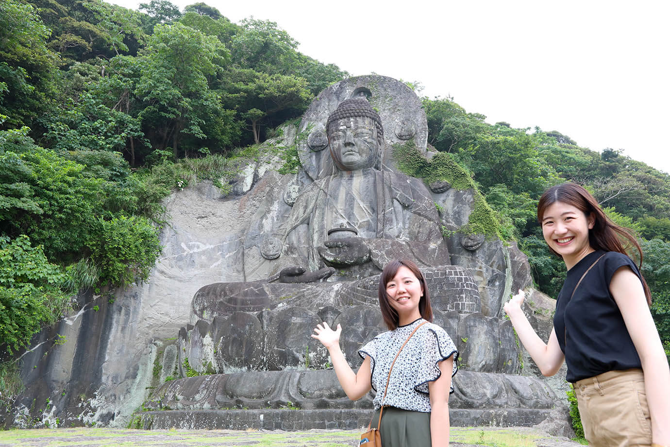 東口管理所で参拝料を納め、少し階段を登ると大仏広場に到着。巨大な大仏様(薬師瑠璃光如来)はかつて世界平和を祈願して大野甚五郎英令が27人の門徒と3年かけて彫刻したものを原型に、昭和44年(1969)に復元されました。総高31.05mと磨崖仏としては日本最大だそうです。