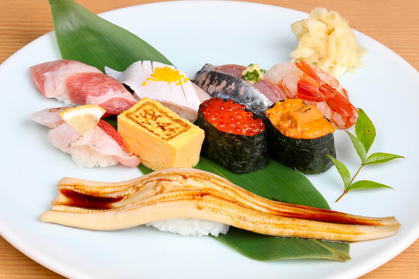 板さんおすすめ3800円はトロ、ウニ、イクラ、旬の地魚、穴子の一本にぎりがセットになっています。煮穴子がやわらかく、口の中でとろけるよう。